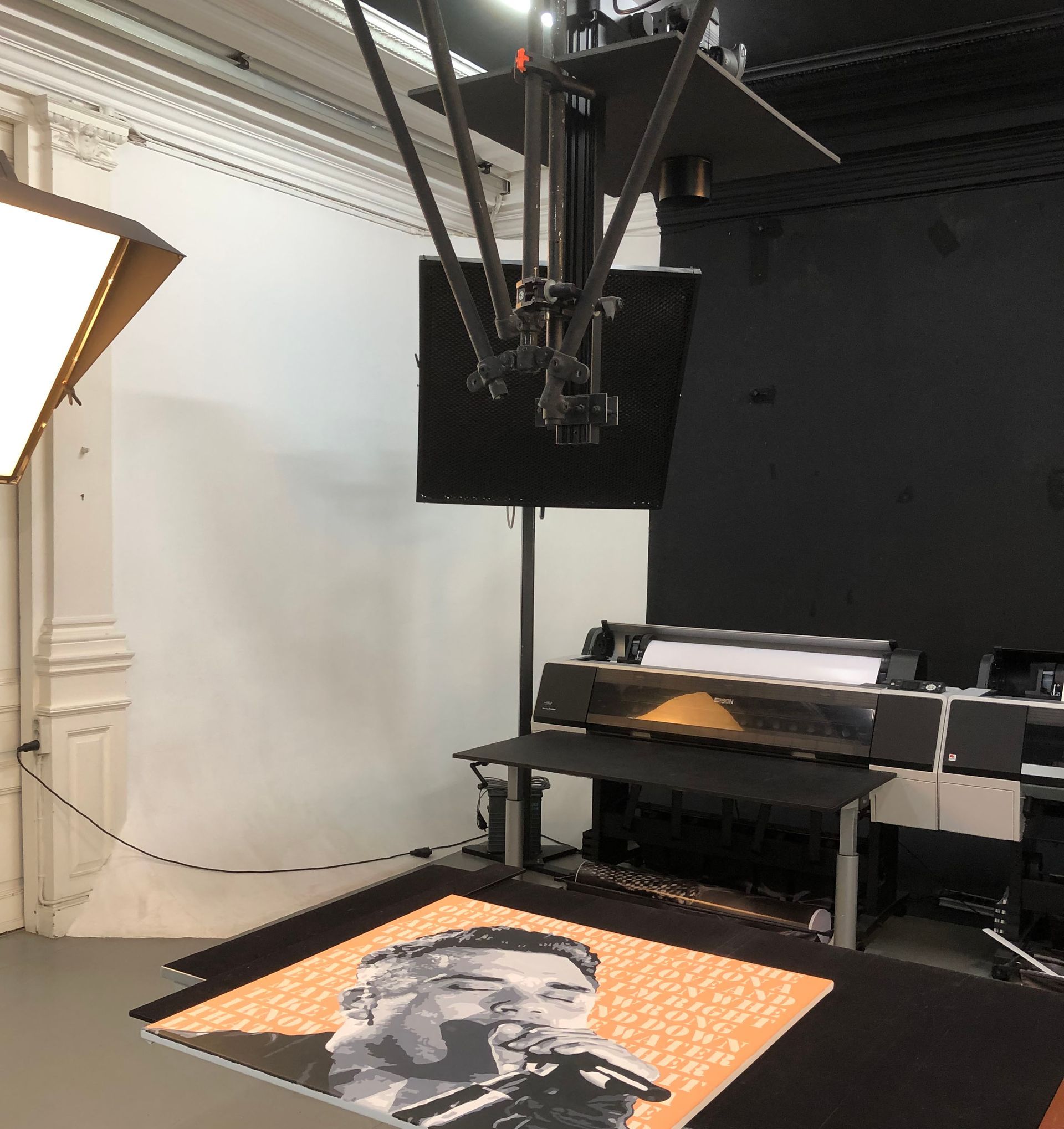 We werken in een studio met een zwart geschilderd plafond zodat er geen reflectie's zijn en waaraan een multishot 50MP Hasselblad camera hangt met een speciale repro-lens.